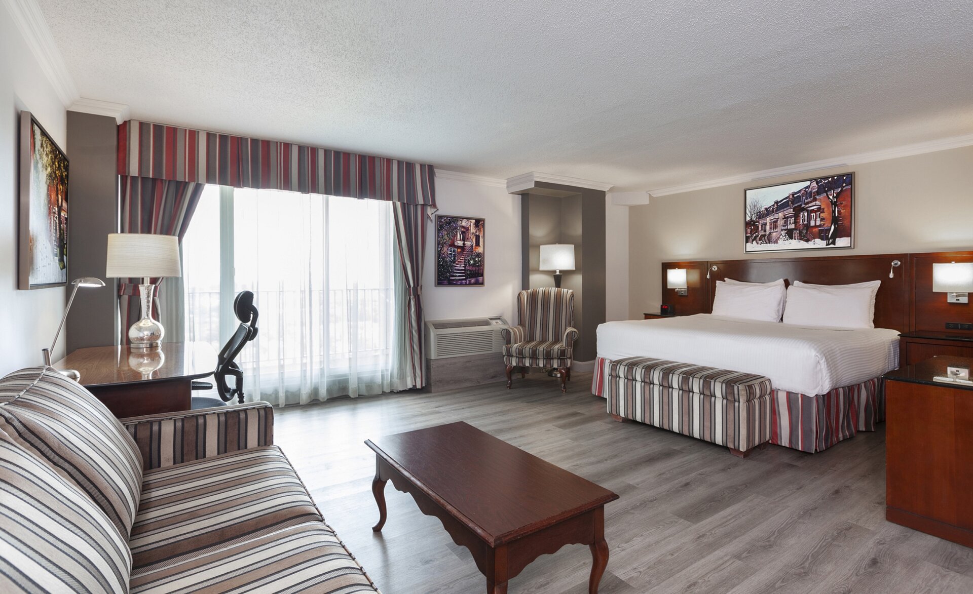 Located on the top floors, our 335 sq. ft. (31 m²) Executive King Room offers sweeping views of Montreal, a luxurious king bed, and an inviting sofa bed. Designed with business travellers in mind, this room balances productivity and relaxation with timeless comfort.