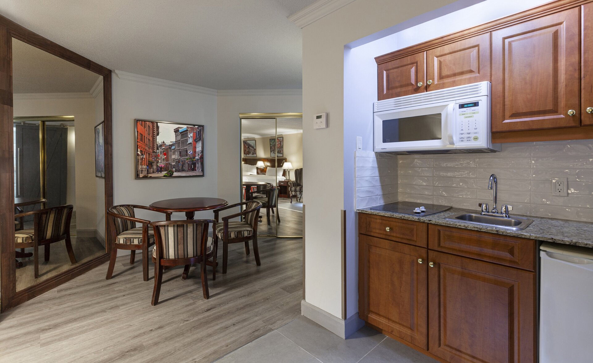 At 490 sq. ft. (46 m²), the Condo Studio offers a residential-style stay with a fully equipped kitchenette, king bed, sofa bed, washer and dryer—perfect for extended visits. Comfortable, refined, and designed to feel like home.